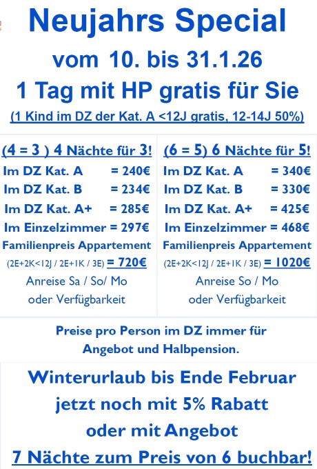 Hier geht es zu unserem Angebot im November 2025Hier geht es zum Angebot im Advent 2025Hier geht es zum Angebot Winterurlaub 2025Hier geht es zum Angebot Weihnachten 2025 und Silvester 2025/2026Hier geht es zu unserem Angebot im März und AprilHier geht es zu unserem Angebot im Mai und JuniHier geht es zu unserem Angebot im Juli und AugustHier geht es zu unserem Angebot im September und OktoberBuchen Sie hier Onlineoder telefonisch: 0800 023 637 7Buchungsanfrage